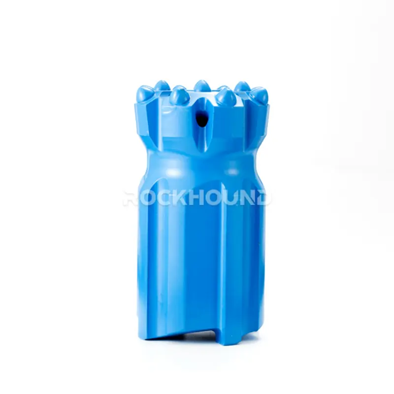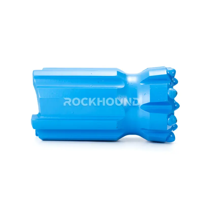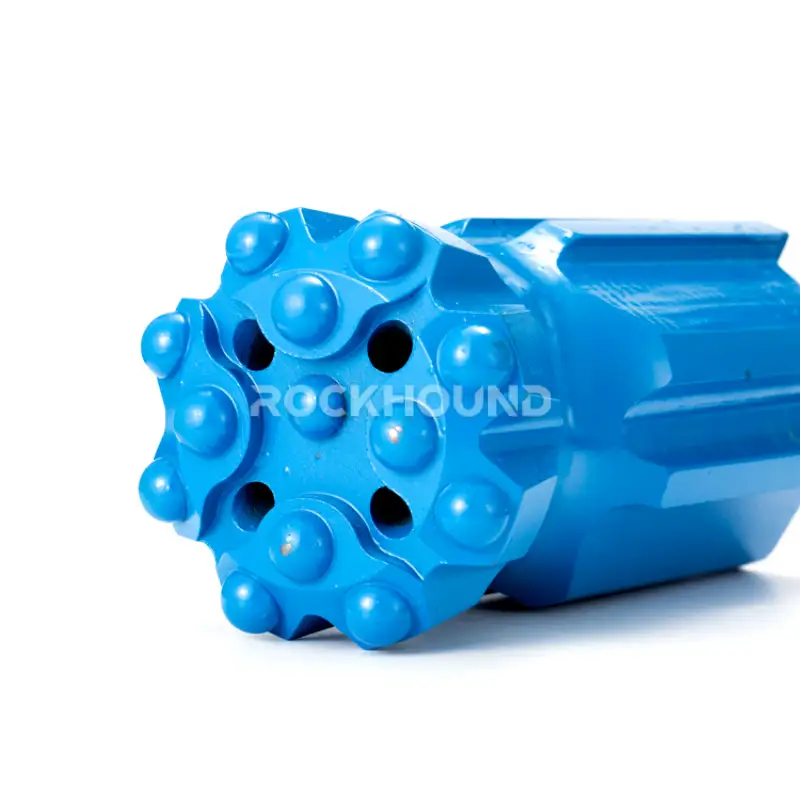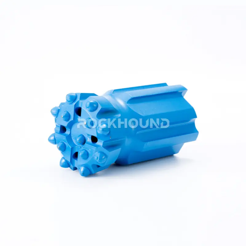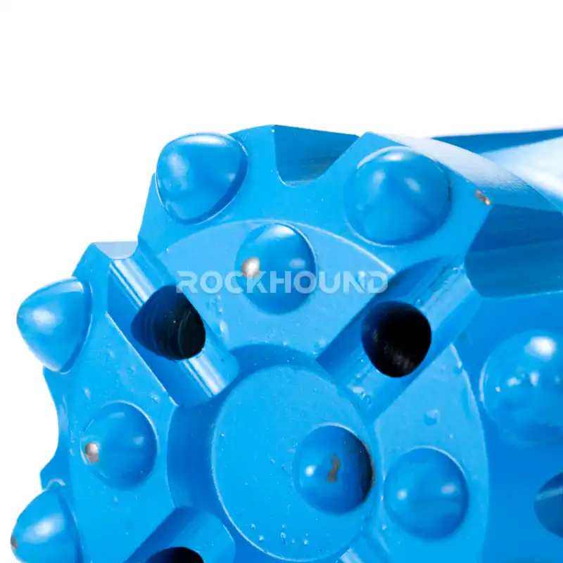 Most T60 bits in the RockHound range use a 35° gauge button angle. The 102 mm diameter variants (product codes ending in 7A04) use 40°. The gauge button angle controls how aggressively the gauge buttons cut the borehole wall. A higher angle (40°) increases contact area per button — better for maintaining hole gauge in abrasive rock like quartzite (SiO₂ > 65%). A lower angle (35°) gives a sharper, more aggressive cut — better penetration rate in softer hard rock like limestone or soft granite.