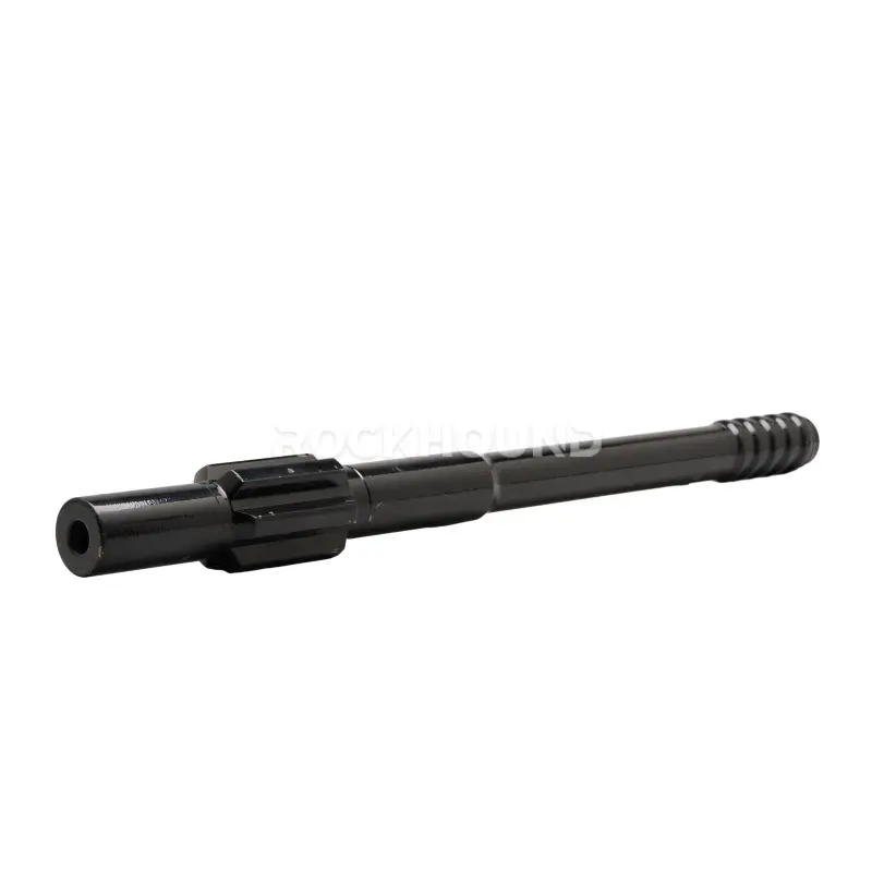 Our R38 and T38 variants share the same 525mm body length, 39.8mm ground shaft diameter, and 9-spline chuck engagement. The difference lies in the thread profile at the drill-string end. R38 uses a rounded rope-thread geometry for quick coupling in tight headings. T38 uses a trapezoidal profile for tighter joints and better energy transfer in longer drill strings. Both are precision-machined from 23CrNiMo alloy steel and put through our 20-hour case-carburizing cycle before final grinding.