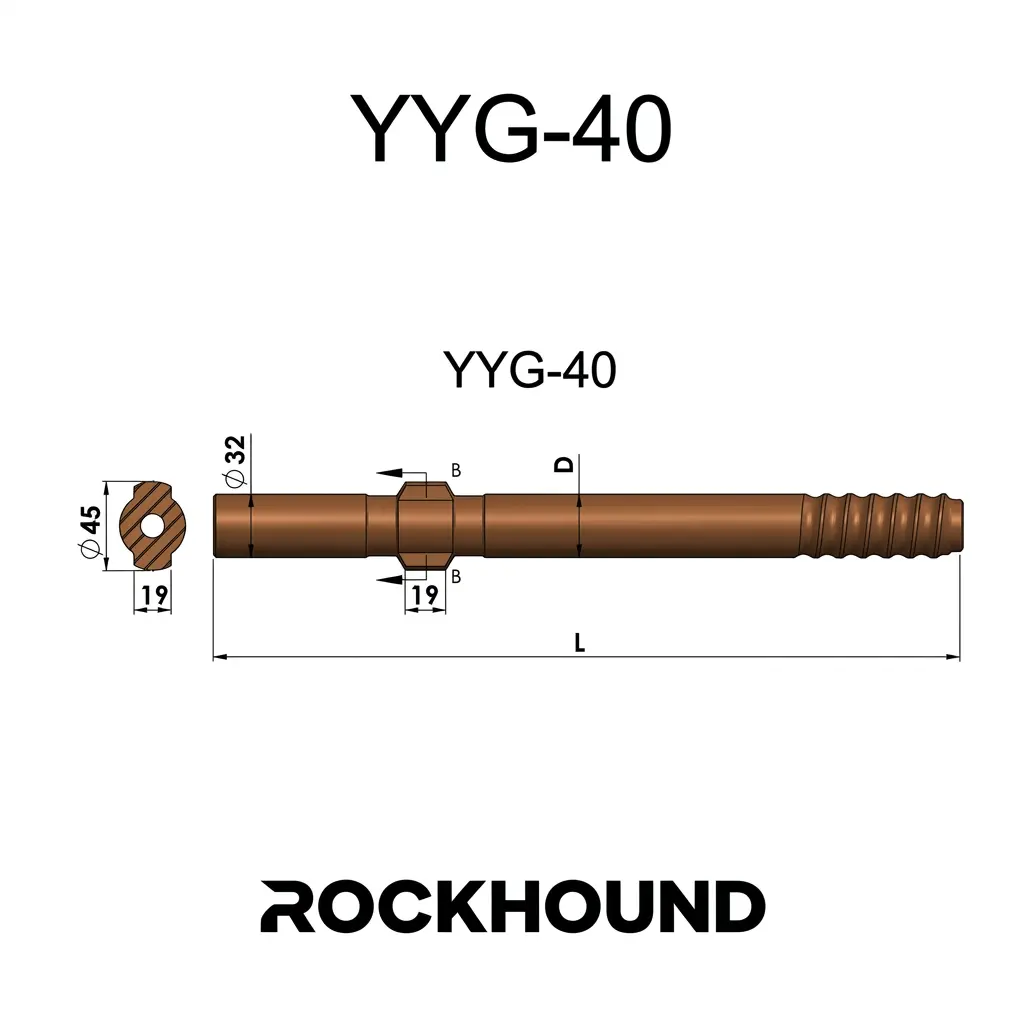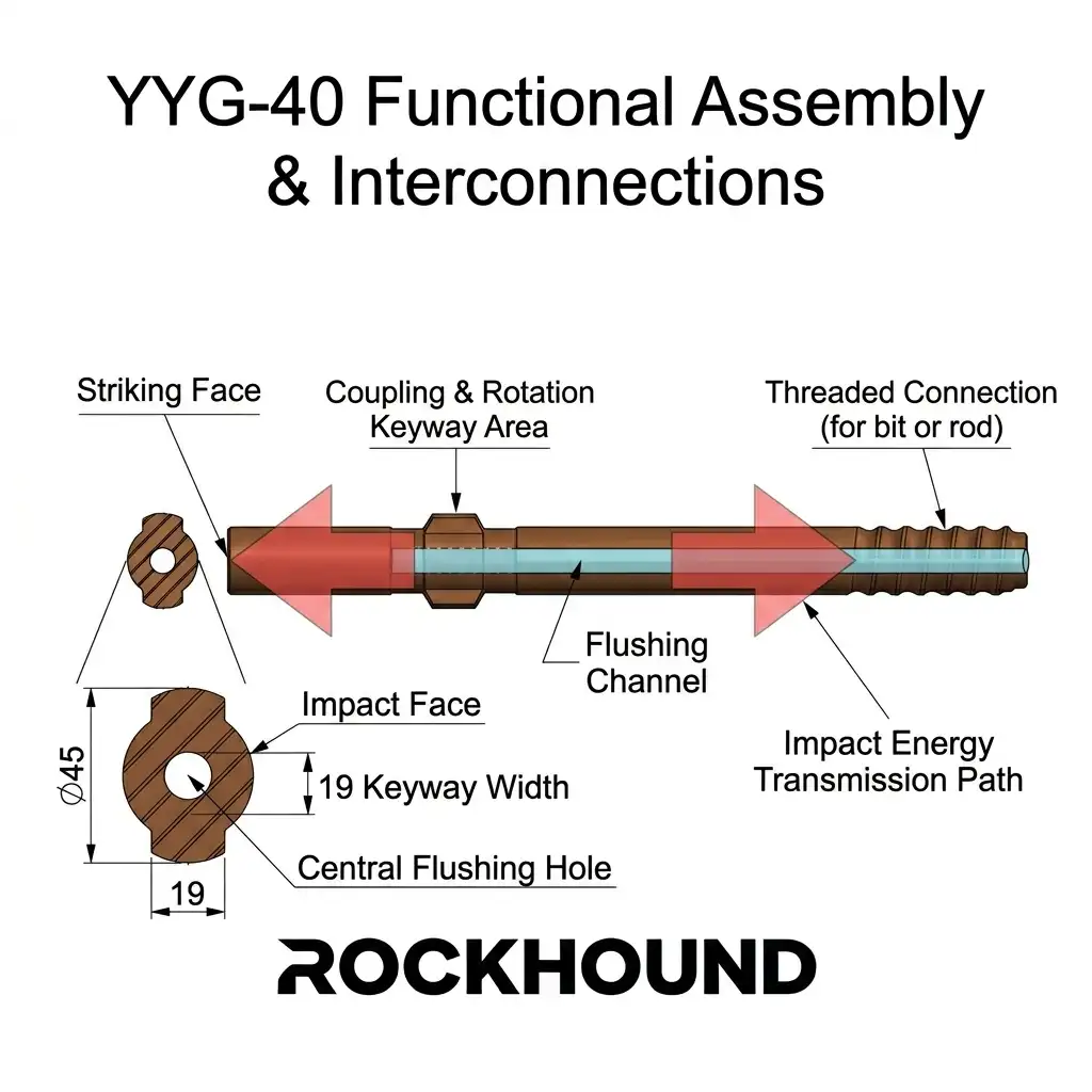 The YYG40 Shank Adapter — also referred to in field terminology as a striking bar or shank rod — is the primary mechanical interface between the pneumatic rock drill and the drill string. It receives direct piston impact, transmits percussive energy down the rod column to the drill bit, and simultaneously transfers rotational torque from the drill’s chuck bushing.